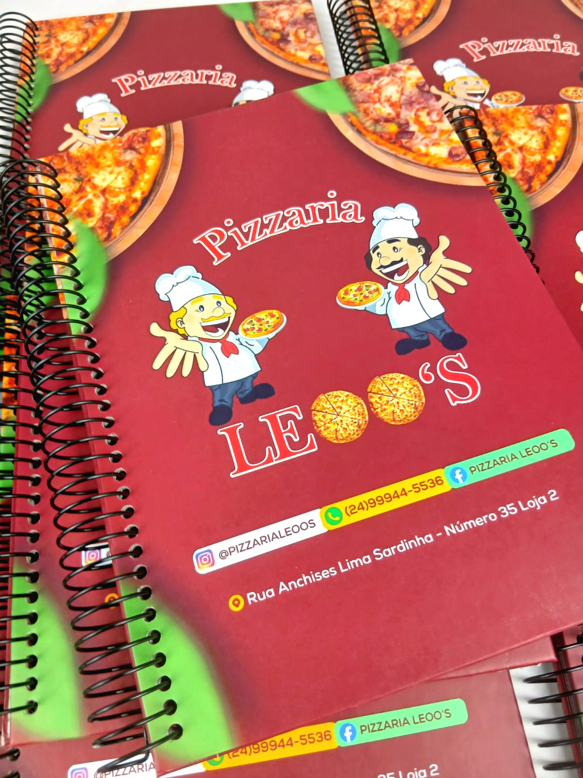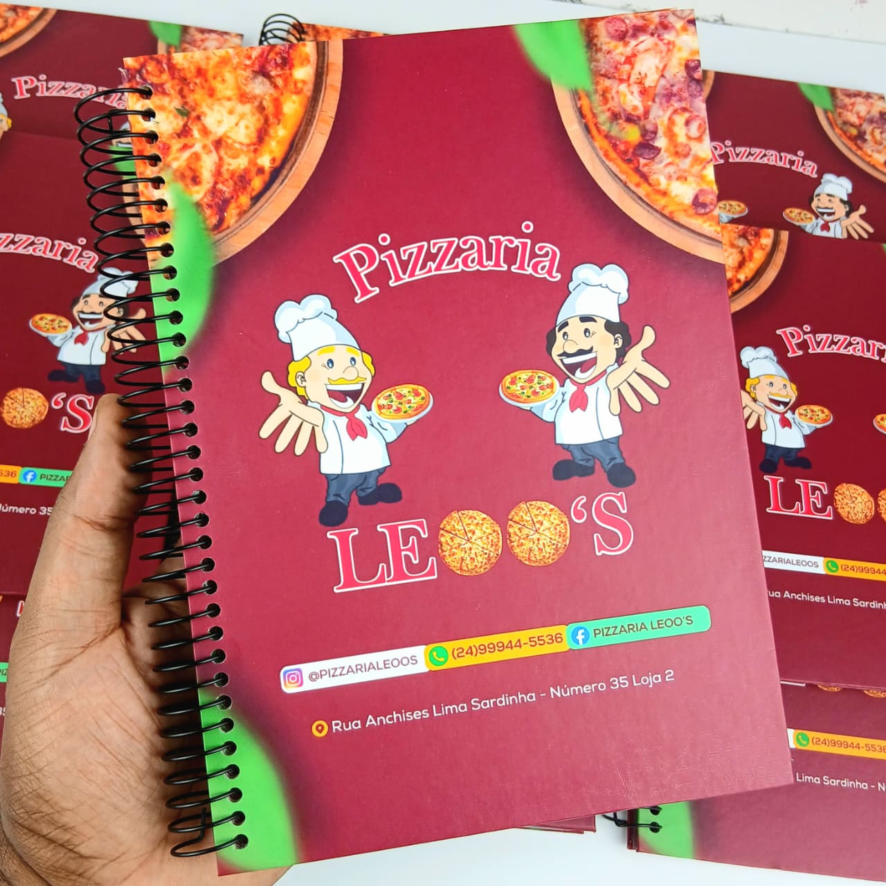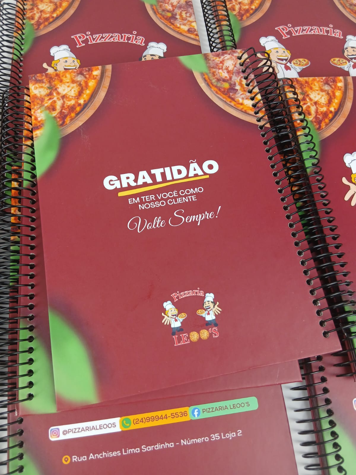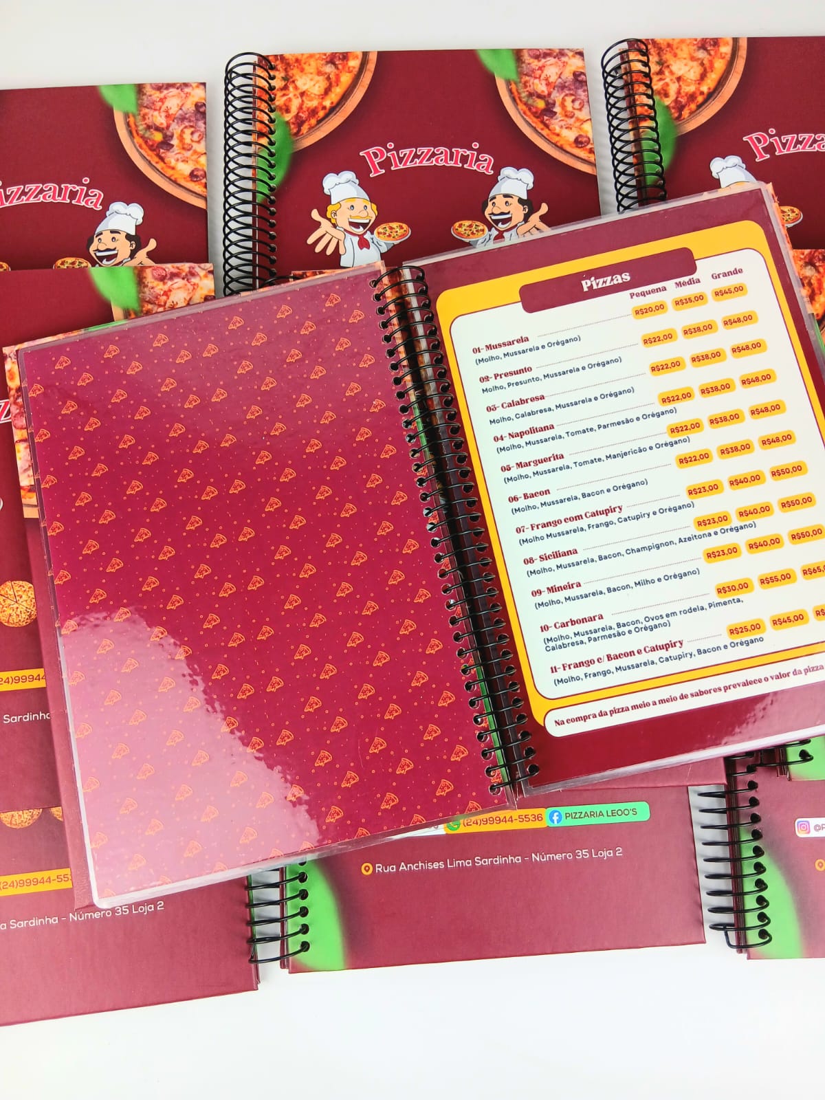 Nosso cardápio personalizado é produzido em capa dura, com acabamento em espiral de aço, garantindo um visual moderno e resistente ao uso diário.